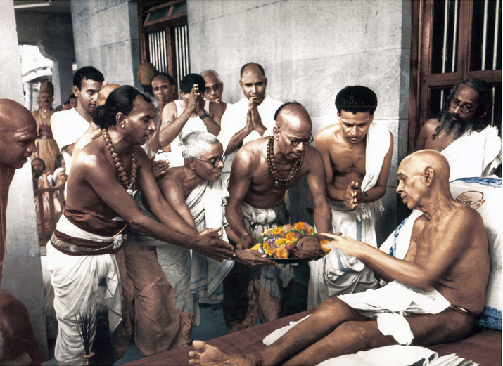 Seated on his large stone divan, Sri Ramana Maharshi Receives an offering of fruit, being presented by a visiting delegation of Hindu priests from the huge ancient temple in the nearby town of Tiruvannamalai