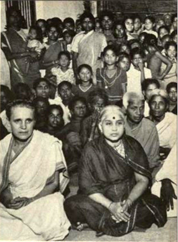 Attending Darshan, Sri Ramana's disciples site crosslegged and silent, listening to his comments on life and Hindu theology