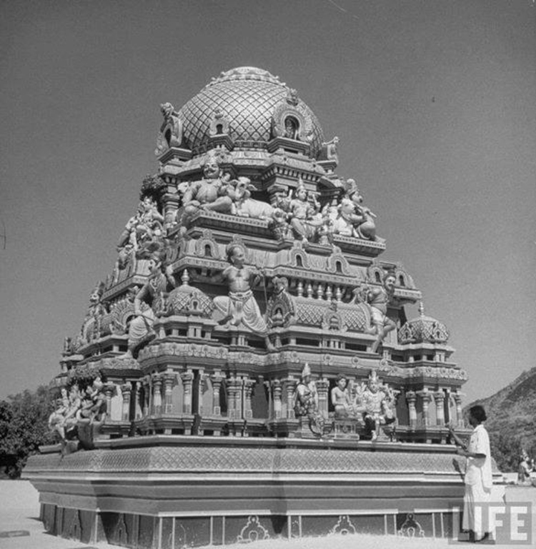 Temple dome swarms with brightly painted statuary. Arrow shows the seated figure of the youthful Sri Ramana.