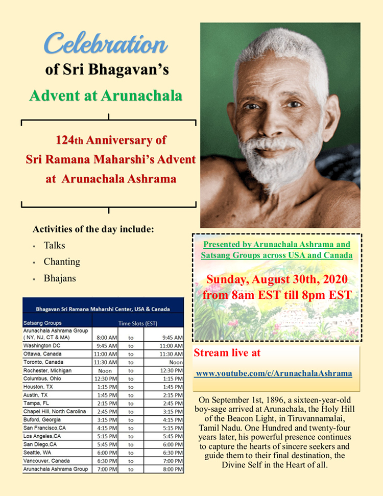 The Satsang Groups of New York, New Jersey, Connecticut, Boston, Washington,DC, Dublin,OH, Detroit,MI, Chapel Hill,NC, Atlanta,GA, Tampa,FL, Houston,TX, Austin,TX, San Francisco,CA, Los Angeles,CA, Seattle,OR, Ottawa,ON, Toronto,ON and Vancouver,BC will each participate in the program which was presented live on the Arunachala Ashrama's youtube channel.