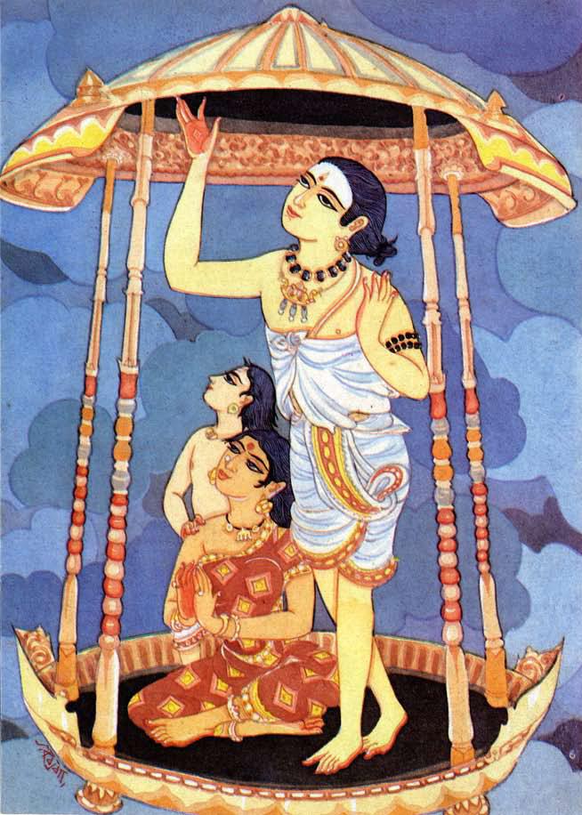 The Brahmachari agreed but said, “First I must bathe in the Holy Kaveri. Please keep this loincloth safe and dry in case it rains. Guard it with your life for its glory cannot be told”. The devotee received the cloth piece reverently, bidding the guest return with all speed. He then put the loincloth in a safe place. When the Brahmachari returned dripping wet from his bath, he asked for the codpiece but lo, it had mysteriously vanished. Amarnēthi took a fresh loincloth from his store and pleaded with the Brahmachari to accept it instead. “Your deceit is now apparent”, said the Brahmachari. Amarnēthi’s face turned pale. He protested his innocence and pleaded mercy, offering to make fair restitution for the lost clothing. The Lord, the owner of the Universe, dressed as the Brahmachari, graciously agreed. He untied the other codpiece from his staff and said: “This piece is a match in all respects to the lost one. Place it in the balance and put your cloth in the other pan so that the weight may be judged equal”. The host was much relieved by this suggestion and put a fresh codpiece from his store into the balance. But finding it was not enough, he piled up other codpieces, though to little effect. Bewildered, he added bundles of clothing and then finally pieces of silver, gold and gems, but all proved of too little weight. (The Lord was out to prove that His grace would outweigh all His devotees’ offerings). The devotee proposed that he, his wife and his son stand in the balance to make good the shortfall. He bent low and touched the feet of the mysterious guest, went around the balance with his wife and son and chanted the Panchakshara. When he and his family stepped into the pan, he called out in supplication to the Lord above: “Lord, may these scales now stand even!” And so, it happened. The spectators of the miracle praised Amarnēthi for his devotion and the celestials showered flowers down from on high. In the midst of this downpour, the young Brahmachari disappeared. The Lord with His consort now appeared and gave darshan to all assembled. Amarnēthi, his wife and son stood in the scales and adored the Lord. The balance climbed up into the sky like a vimana, carrying them up to the Lord’s abode.