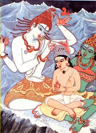 One day, someone complained to the town elders of the apparent waste of milk. They sent for the boy’s father, who upon hearing the complaint, said, “I hold myself fully responsible”. That night the boy’s father went to bed without making any enquiry of his son, whom he intended to surprise the next morning. The following morning the unknowing celibate set out as usual to fashion the image of the Lord with river sand, and then with due rites, began to bathe the Lord with milk. The Lord now wished to disclose to the world the full glory of this devotee. Not realising the Lord’s grace, the Vedic father grew angry at the apparent waste of milk by his son and rushed towards the boy and beat him mercilessly. But the child, absorbed in his devotion, was unconscious of the beating and continued his worship. The enraged father then maliciously kicked over the pot of milk collected for the Lord. When the milk spilt out onto the ground, the child seized a stick, which by the Lord’s will became in that moment an axe, and hurled it at the offending foot. His father soon lay prostrate on the sand with foot cut asunder. Meanwhile, the youngster resumed his worship and the Lord manifested Himself before them. The youngster fell down in adoration at the gracious feet of the Lord who spoke in a mighty voice: “For My sake, you challenged even your own father.” At the touch of the Lord, the little boy’s ‘maya’ body rose up in Saivic splendor and he appeared in a halo of light. The father too, by the grace of his devoted son, was cleansed of his offence and along with his kin, attained Siva Loka.