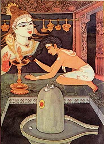 One day he found no purchasers for his grass bundles, so he used the grass itself for lighting the lamp. When this proved inadequate he had nothing left to offer but the long locks of his head, which he offered just as they were, unsheared! In so doing, he unwittingly burnt away all the effects of past karma. Lest the devotee immolate himself, the Lord appeared and took him to Sivaloka.