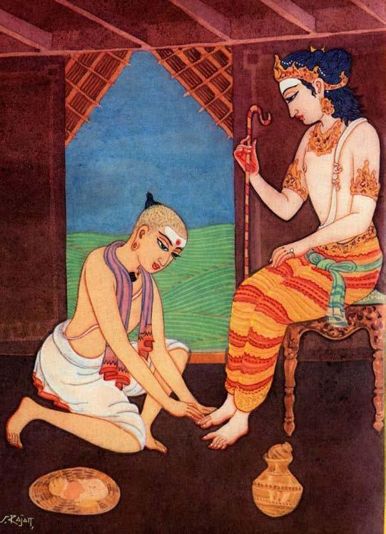 Somāsi worshipped the Lord with great fervour during his daily yagnas. But for a long years he yearned to have darshan of the Lord and to offer him havis at his yagna. Knowing that Sri Sundara was a great devotee of the Lord and had been granted the grace of the Lord’s presence on numerous occasions, Somāsi sought to win his favour, hoping that Sundaramurti might petition the Lord on his behalf. Knowing that Sundara loved preparations from the alarka plant, the somyaji searched high and low till he found it. Each day he went and collected it and secretly left it with the saint’s cook, who willingly prepared delicious dishes from it each day for his master. One day, however, there was a terrible downpour and the river flooded, preventing Somāsi from crossing to reach the meadow where the herb grew. He waited in the pouring rain for three days before he was able to cross. Meanwhile Sundara missed his favourite dish and inquired about it. The cook reluctantly confessed everything, telling about the secret admirer who had been supplying the herb. When Somāsi next came to deliver the plant, Sundara questioned him and then learned of his longing to have darshan of the Lord. Moved to compassion, Sundara promised to arrange it.