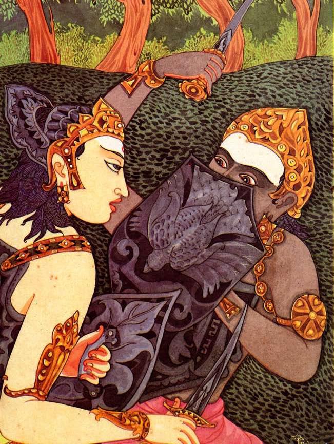 Athisooran strategized his next offensive. Deciding that he could only win by deceit, the following day, for the first time in his life, he smeared white bhasma (ash)—the signature of Siva devotees—on his forehead. Concealing his face with a metal shield, he challenged Yenādhi to one-on-one combat. Once accepted, the two set about to fight each other. But just when Yenādhi gained the upper hand, Adhisooran let down his shield to reveal his bhasma-smeared forehead. Yenādhi stood transfixed, admonishing himself for having almost killed a devotee of the Lord. Though he suspected affectation on the part of his adversary, he dared not fight him further as the sacred white ash should be honoured at all costs. The villain took advantage of the opportunity and plunged his sword deep into the heart of Yenādhi. As the saint lay dying, the Lord recognised his glory, gave him darshan and removed the last traces of bondage. He then bid the saint to come and dwell with Him at Kailās forever.