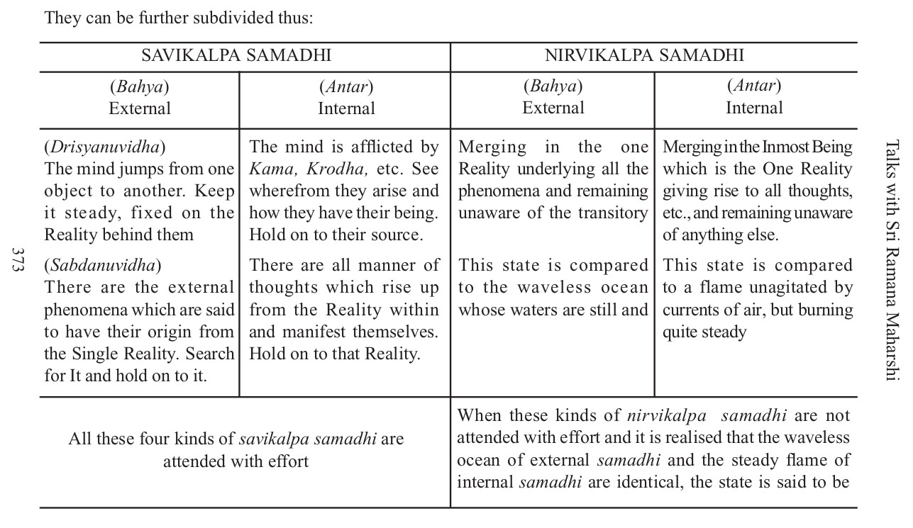 When these kinds of nirvikalpa samadhi are not attended with effort and it is realised that the waveless ocean of external samadhi and the steady flames of internal samadhi are identical, the state is said to be sahaja nirvikalpa samadhi.