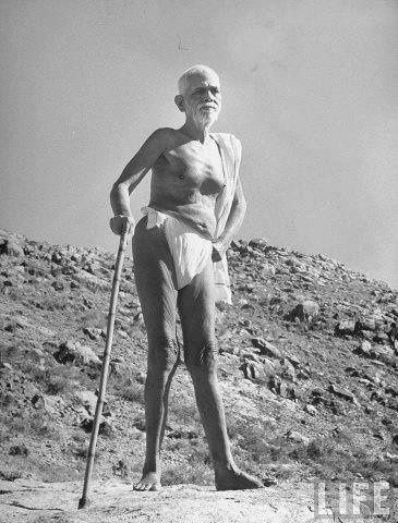 With the help of a cane, Sri Ramana Maharshi takes a walk at the foot of the sacred mountain. Though slightly lame, Sri Ramana has a vigorous constitution, lives with a yogi's abstemiousness