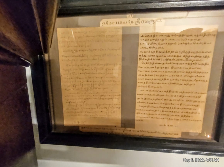 “In the Nirvana Room in Sri Ramanasramam, there is a framed Tamiḷ translation of Na Karmana written on two pages. The page on the left, which is in pencil, is Bhagavan's draft; the page on the right is the same Tamiḷ text but is a fair copy in ink, written by P.N.Swaminathan Iyer. Sri K.Natesan who was there when this translation was written said that Bhagavan had asked him to make a fair copy of his translation in ink, but his former math teacher, P.N.Swaminathan Iyer, who was also there, insisted he must do it. The fair copy in ink is his. The date written at the bottom of the sheet is 10-9-1938, one day after the entry in Talks. By these dates we can infer that Bhagavan probably had been requested to provide the devotees with a Tamiḷ translation at the time Chadwick translated it into English.”