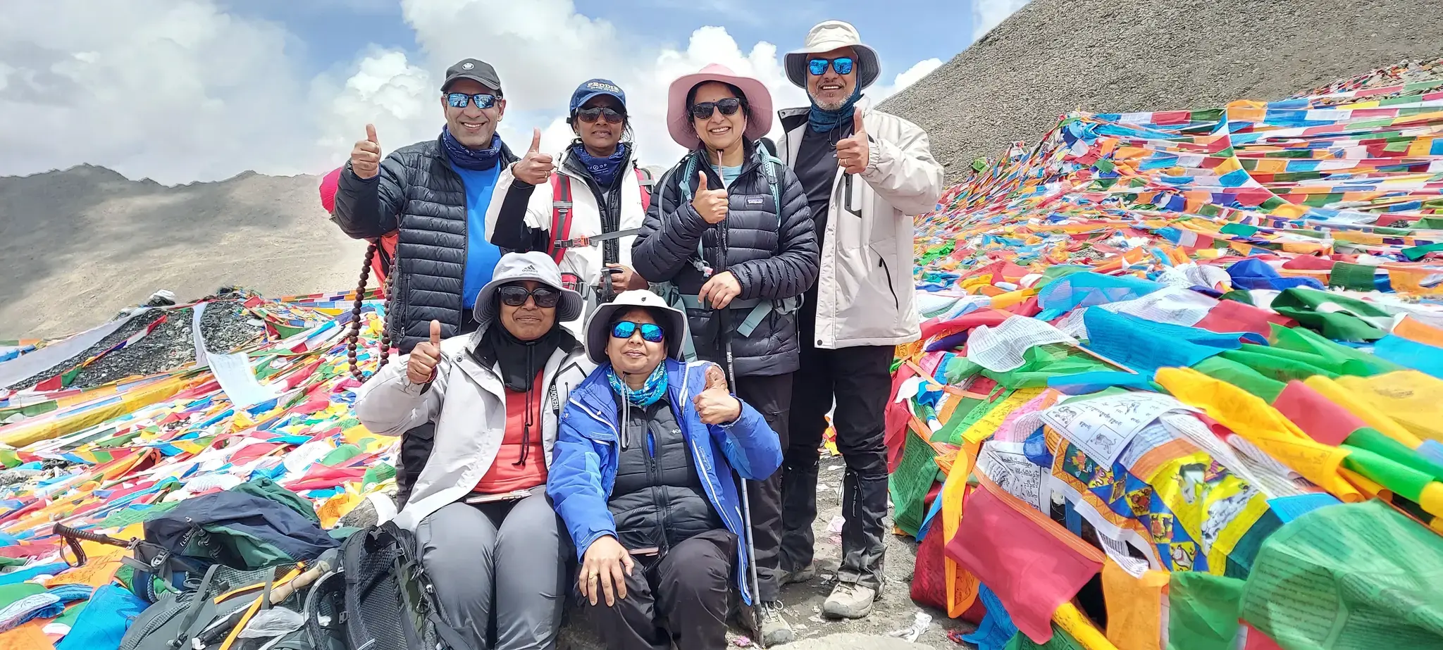 As mentioned earlier, Lavanya, Sangeetha, and I formed one group, and we were almost half an hour behind the lead group of Swami, Nimmi, and Shridhar. The three of us encouraged each other, checking in constantly to make sure we were doing okay. We tried to crack jokes to distract ourselves from the exhaustion and kept a steady stream of candies going to keep up the energy. Our guide, Tashi, also kept a watchful eye on our group. He would walk with us when we needed encouragement and try to convince us that the next pass above us was the highest point, and it was only downhill after that. Of course, this was to keep us going, and there were several such passes before we reached the highest point of the Dolma La Pass at around noon that day! It was an exhilarating feeling, rejoicing and broad smiles were on all the hikers' faces. The pass was covered with prayer flags, and we spent several minutes among those colorful flags fluttering in the wind, carrying with them prayers of the devout to the heavens.